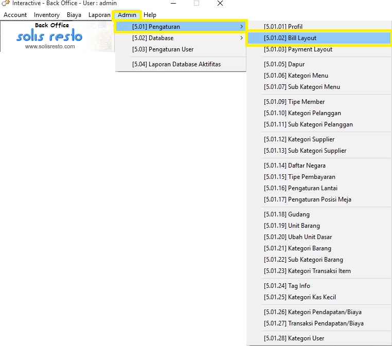 Setelah log in berhasil Selanjutnya pilih admin lalju pengaturan lalu klik bill layout