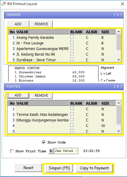 Cara pengisian klik header dan footernya lalu klik 2x dan ketik sesuai nama resto nya.
