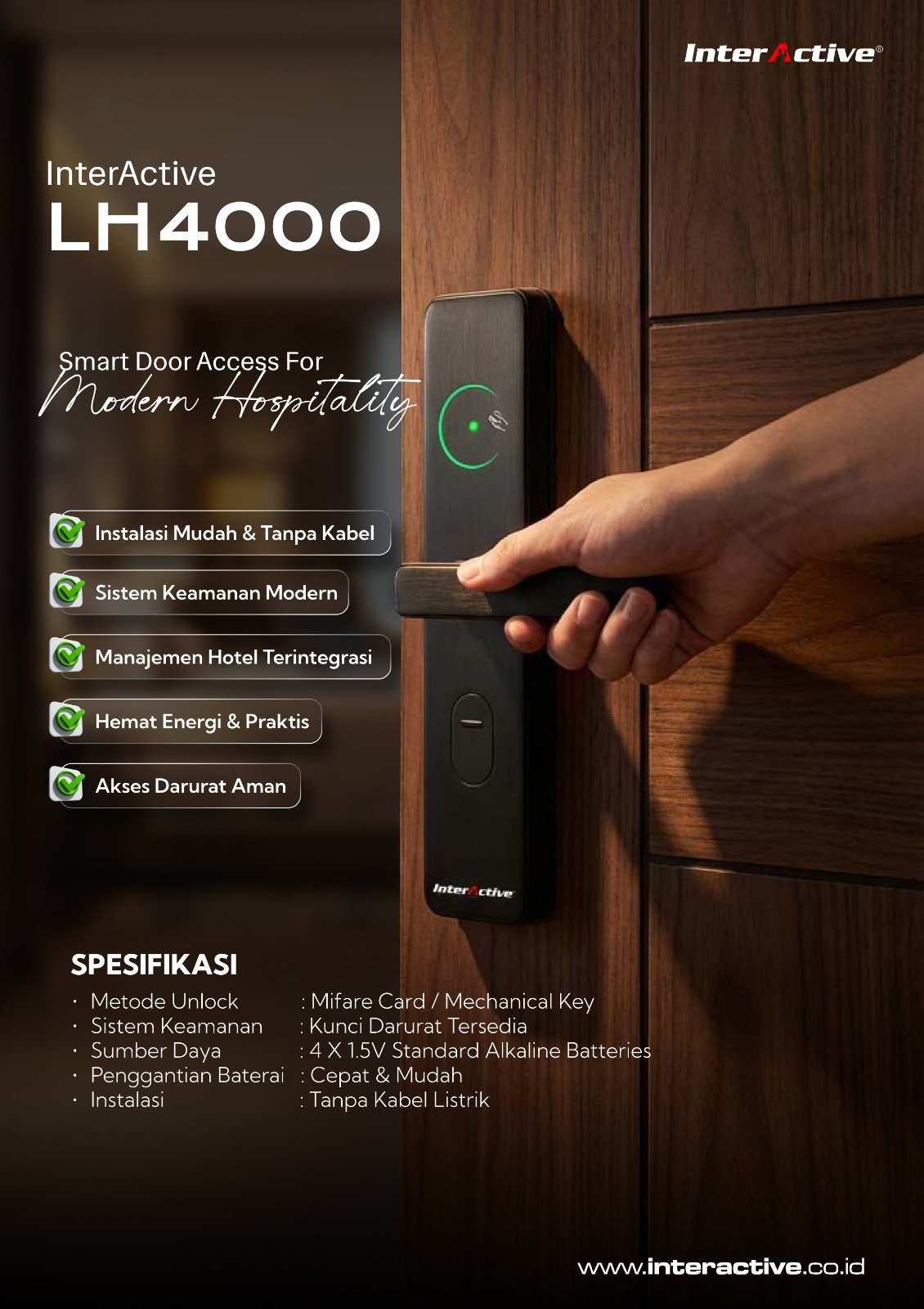 Tingkatkan keamanan dan kenyamanan kamar dengan Hotel Lock modern yang sudah terintegrasi Software Hotel. Kini hadir InterActive LH4000.