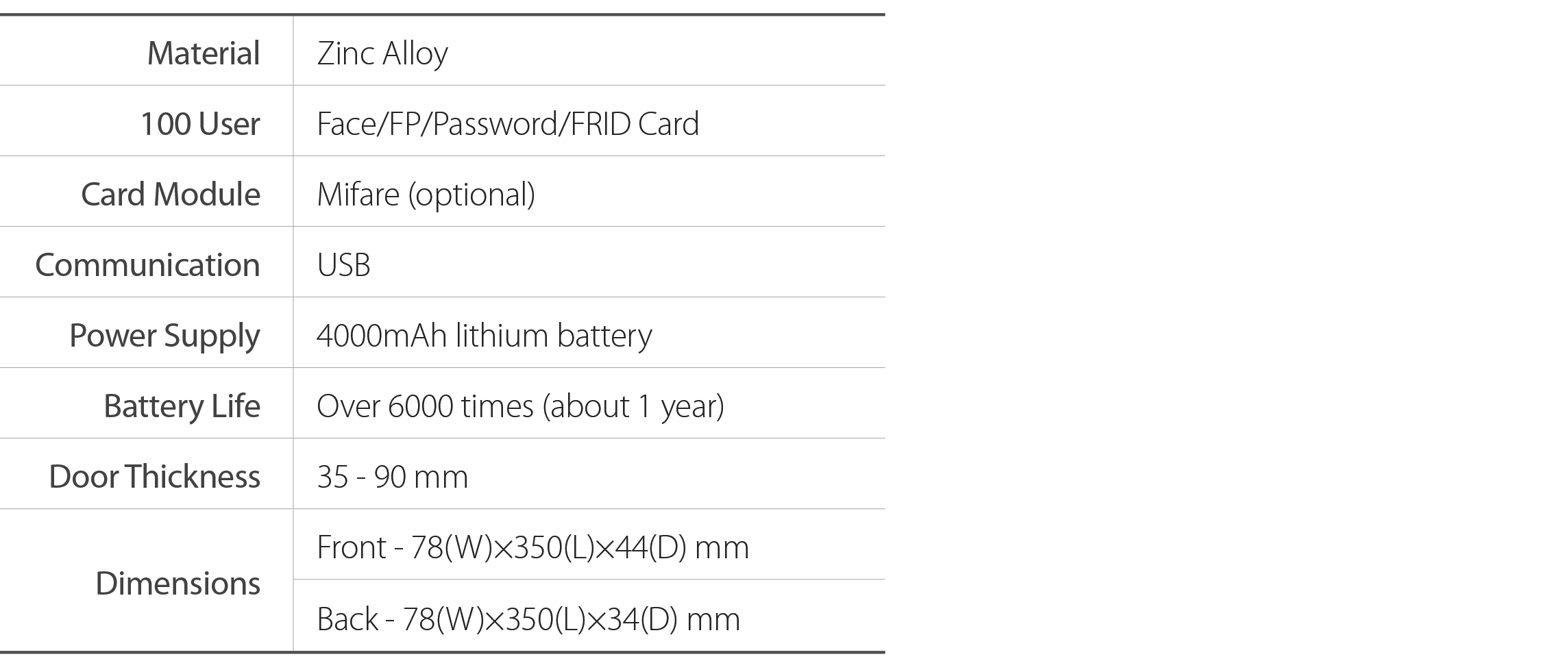 Smart Lock dengan teknologi pengenalan biometrik hibrid. Menyediakan cara membuka kunci keamanan tinggi dengan mode keamanan – Wajah + Sidik Jari. Desain “reversibel” agar pas untuk semua arah buka pintu. Dengan baterai lithium yang dapat diisi ulang.