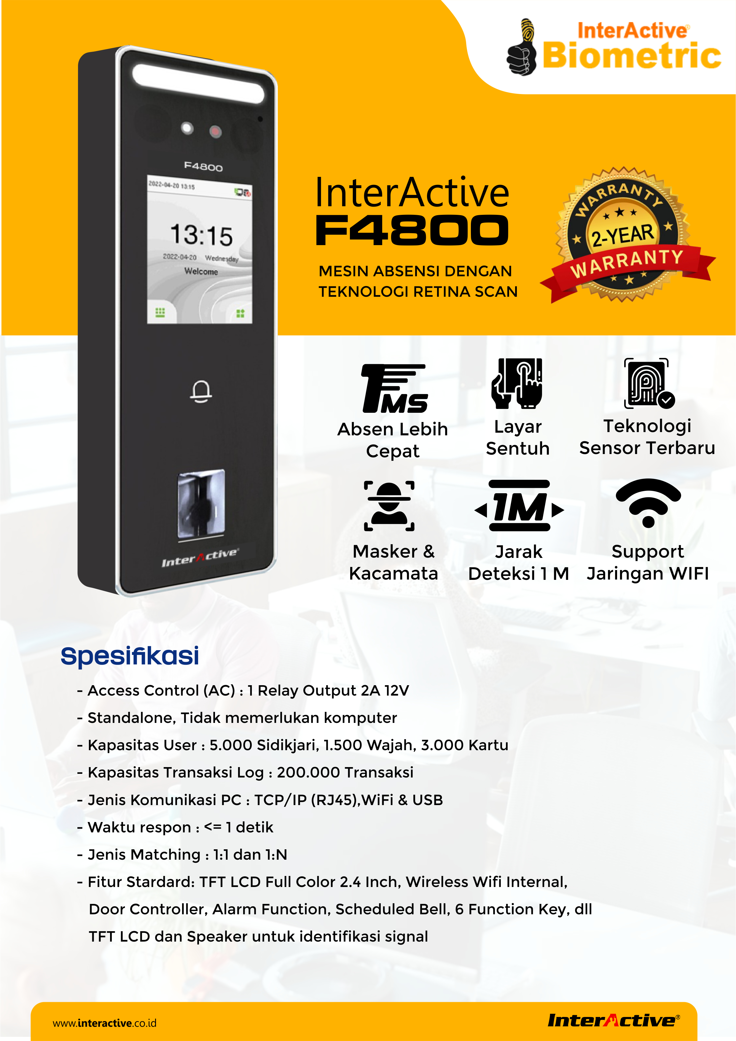 mesin absensi WajahMesin InterActive Biometric F-4800 adalah Mesin dengan teknologi retina scan menjadikan absen lebih cepat ketimbang mesin absensi pada umumnya serta didukung fitur layar sentuh, teknologi sensor terbaru, absensi wajah bisa menggunakan masker dan kacamata, jarak deteksi sampai 1 meter juga pastinya support jaringan wifi.
