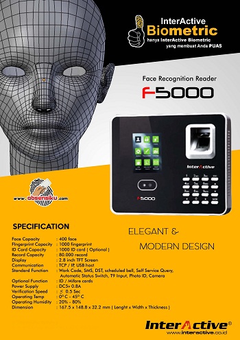 Hadir Model Terbaru Mesin Absensi Face ID F5000 dengan Desain Modern dan Elegan. Kombinasi Scan Wajah, Fingerprint, dan RFID Card. Urusan Absensi Menjadi Mudah dengan InterActive Face ID.